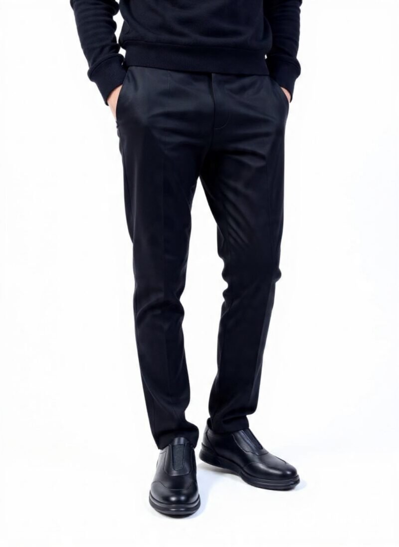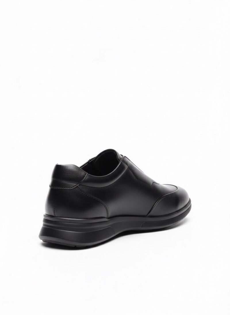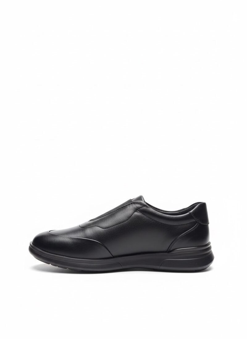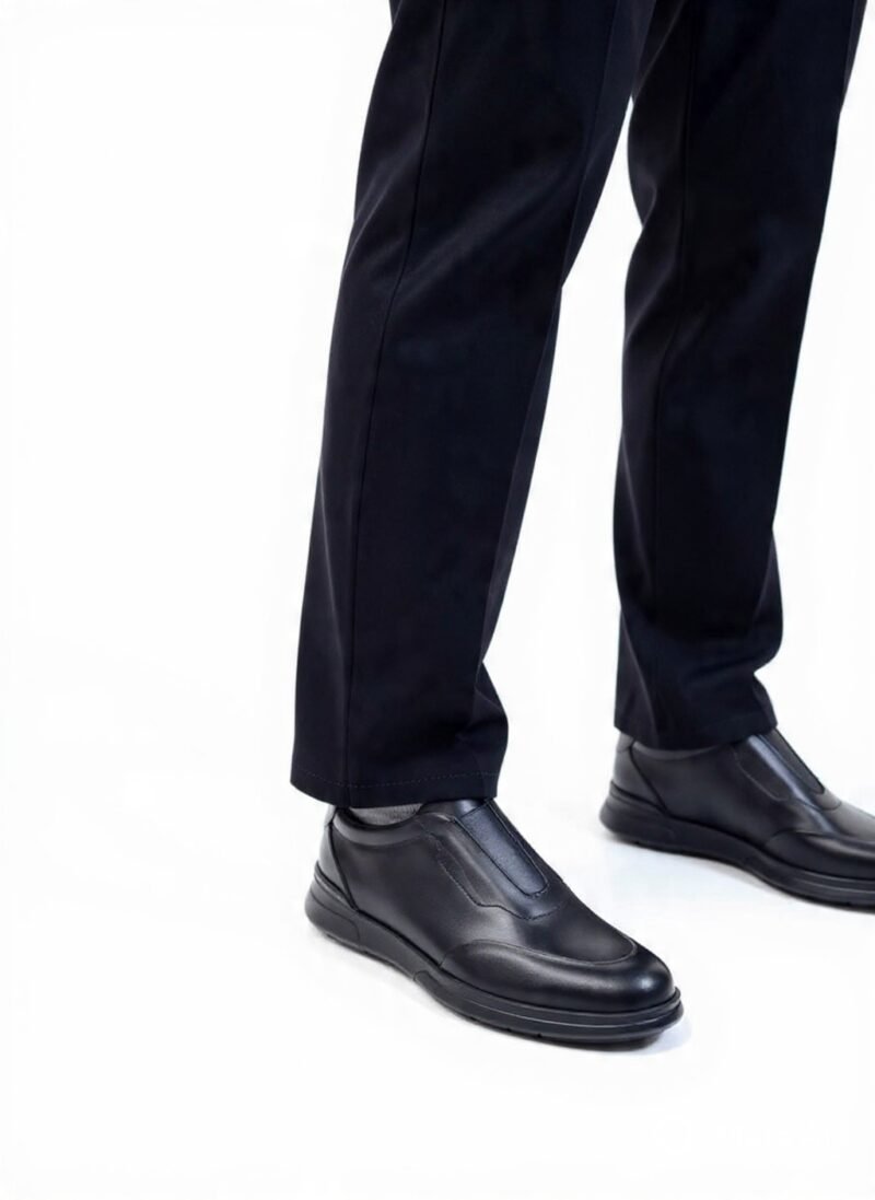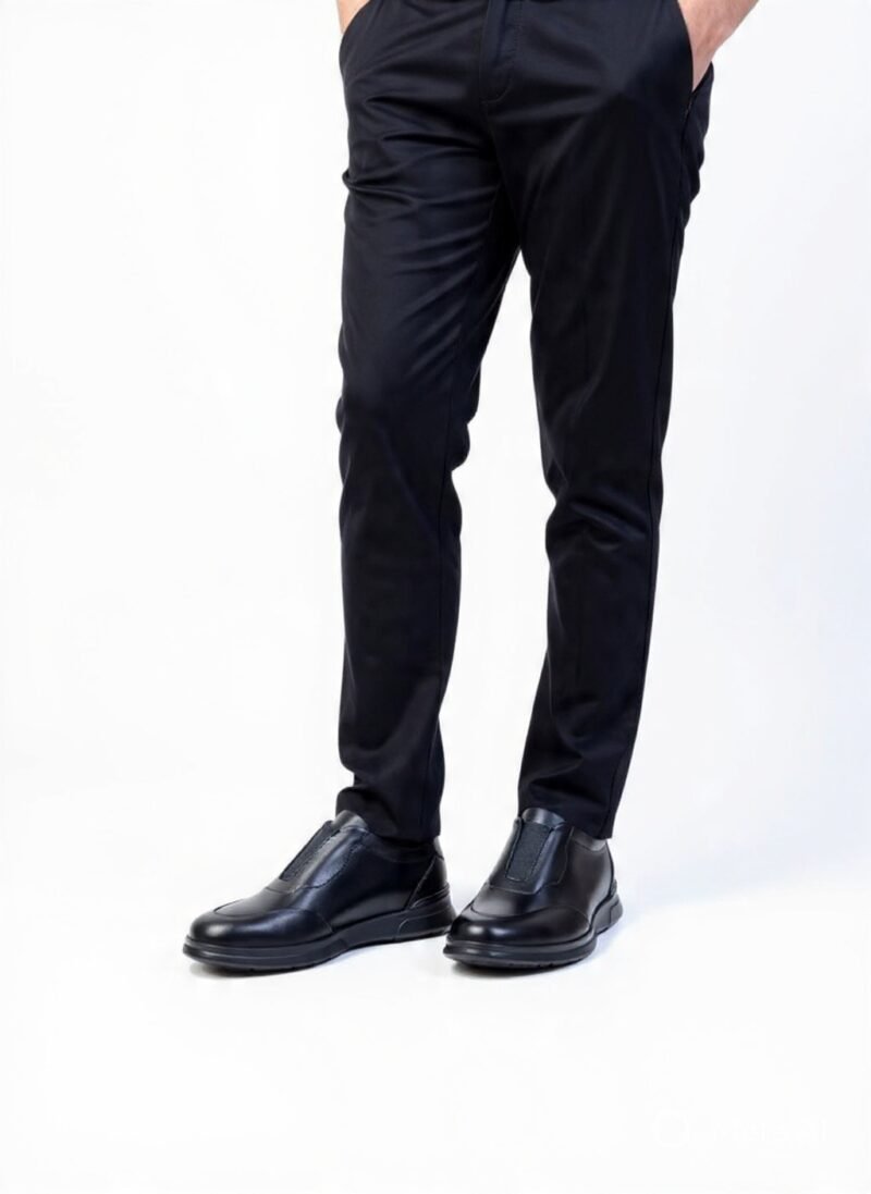 Chaussures en cuir noir luxueux Basstoni, modèle slip-on moderne avec empeigne lisse et zip discret pour un enfilement facile. Semelle épaisse noire eva offrant confort et style urbain, portées ici avec un pantalon noir pour un look sophistiqué et polyvalent au quotidien.